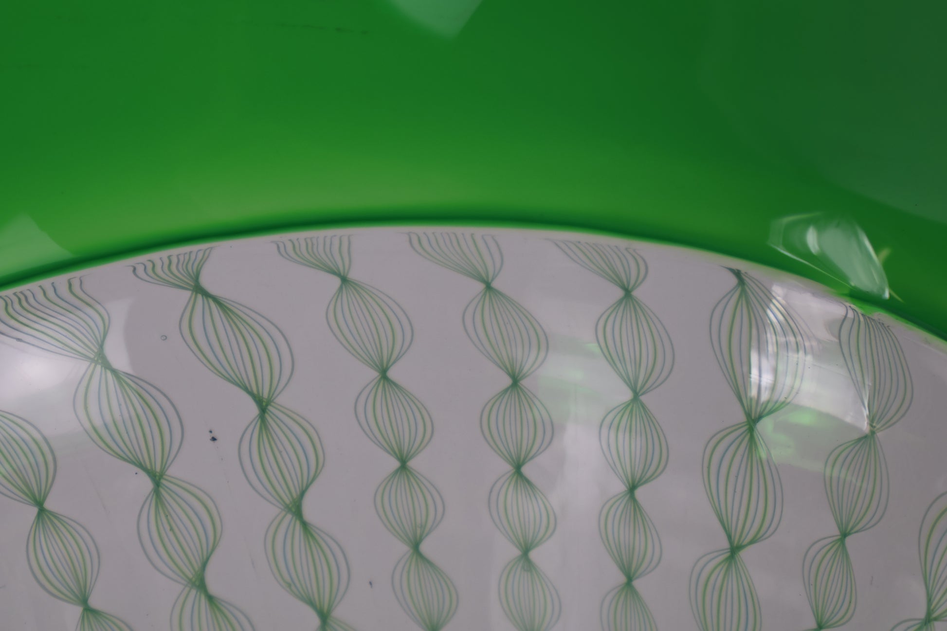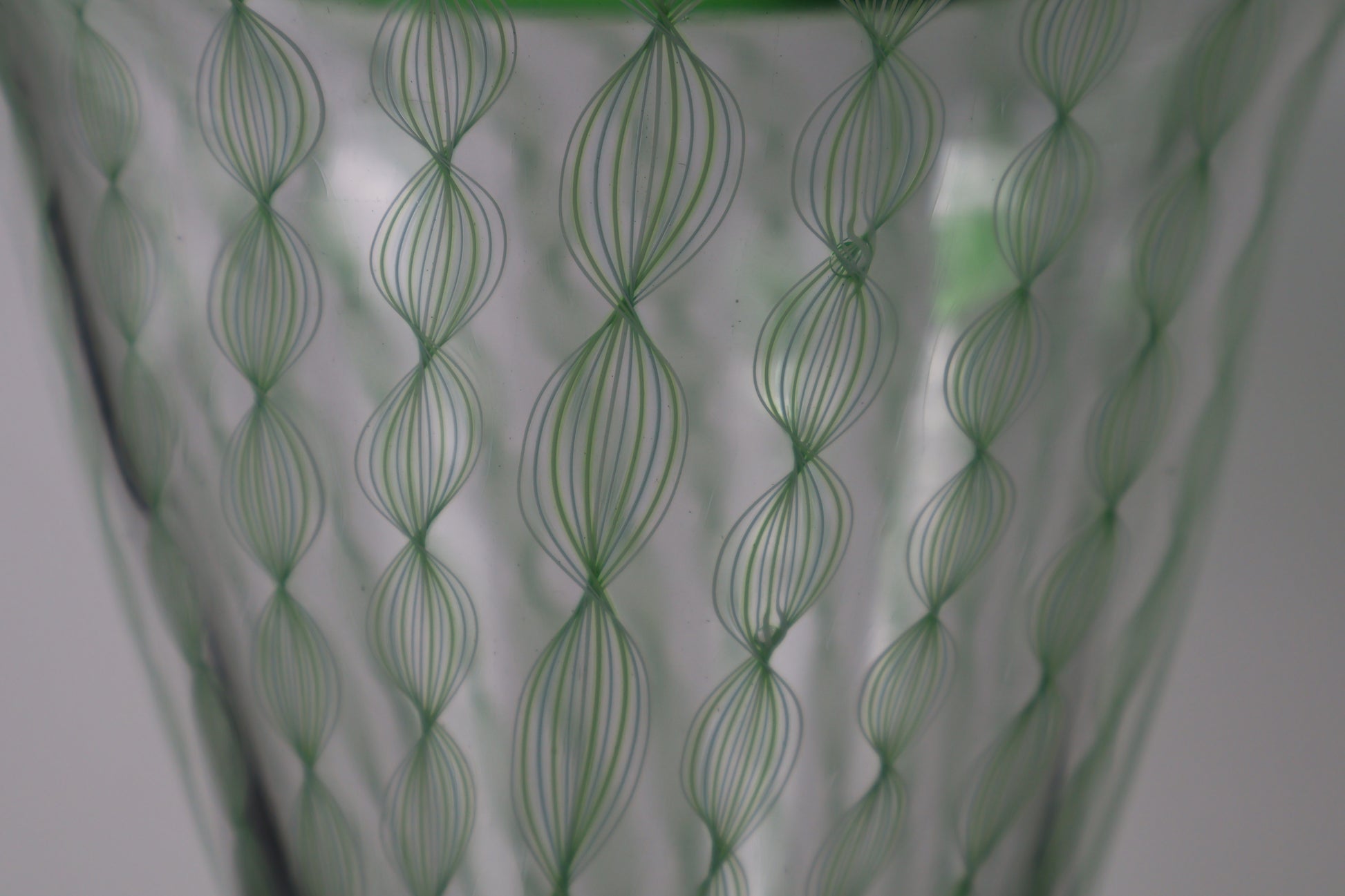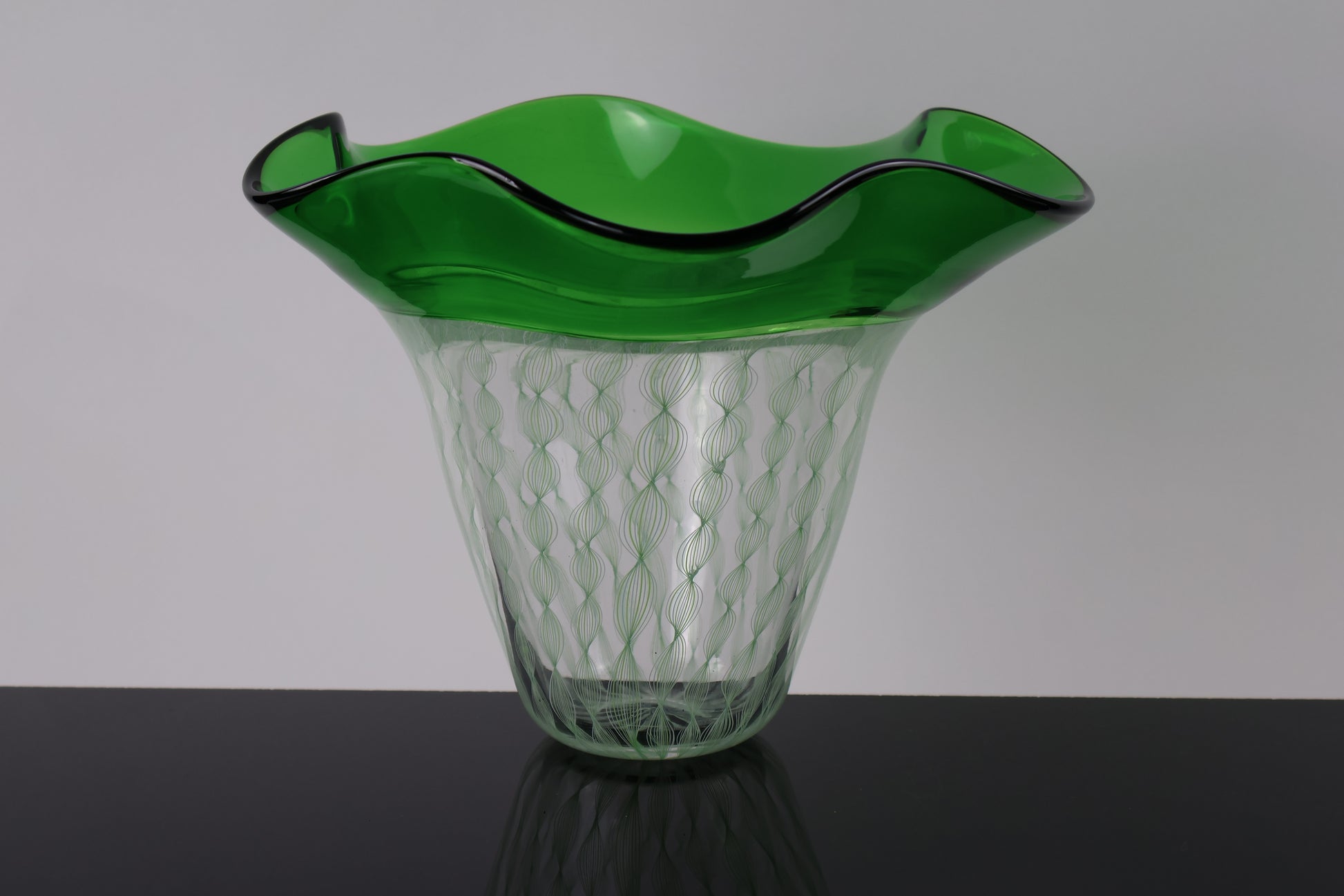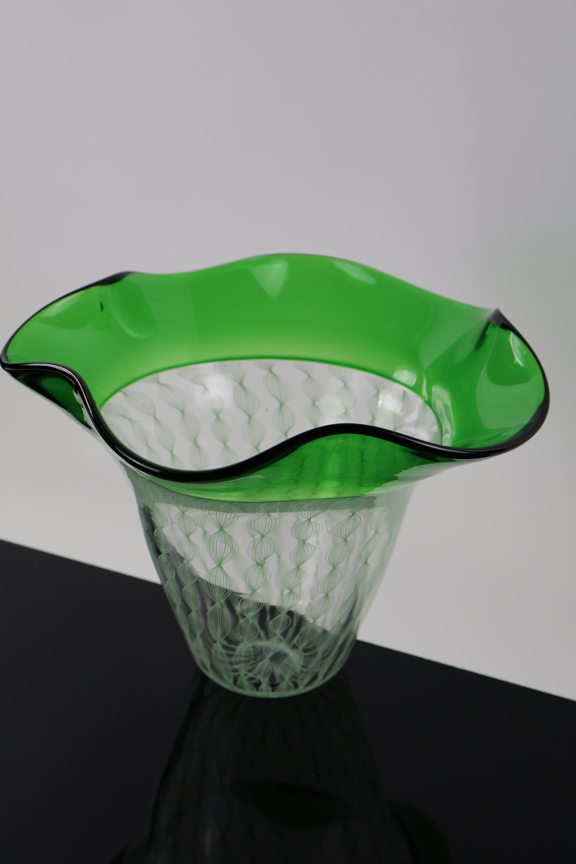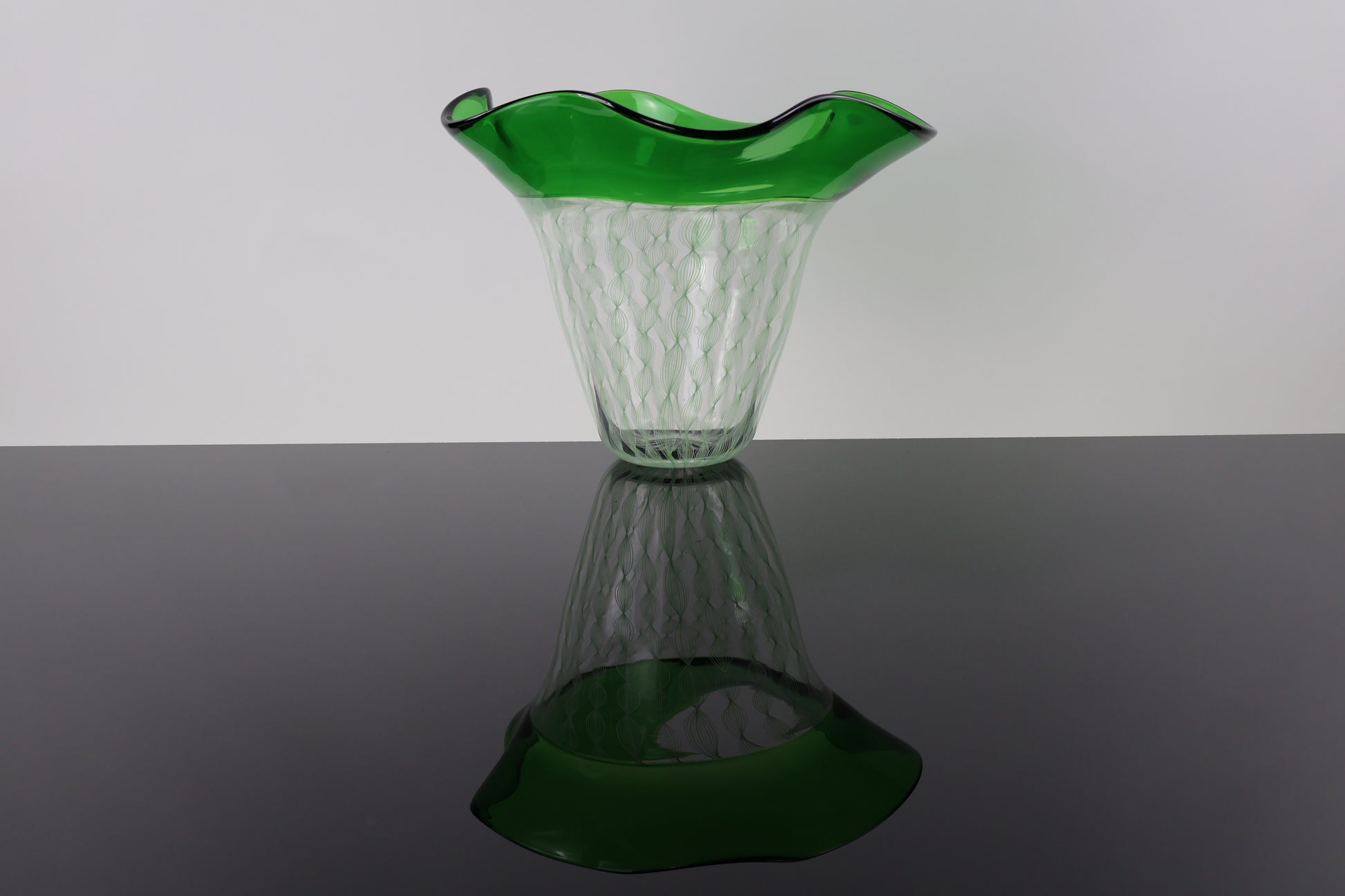 This elegant handblown vase was crafted using the encalmo technique, seamlessly joining two distinct sections of glass into one harmonious form. The top features a vibrant green band with a soft, wavy lip that flows outward, contrasting beautifully against the clear lower half. The base showcases intricate balotini cane work — a delicate lattice of interwoven lines that create mesmerizing optical depth. This piece captures both technical precision and organic movement, making it a striking centerpiece for any space.
