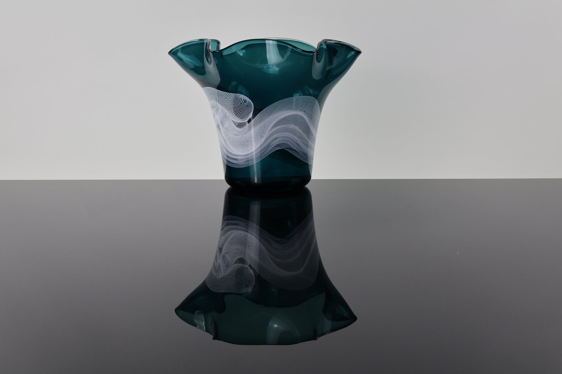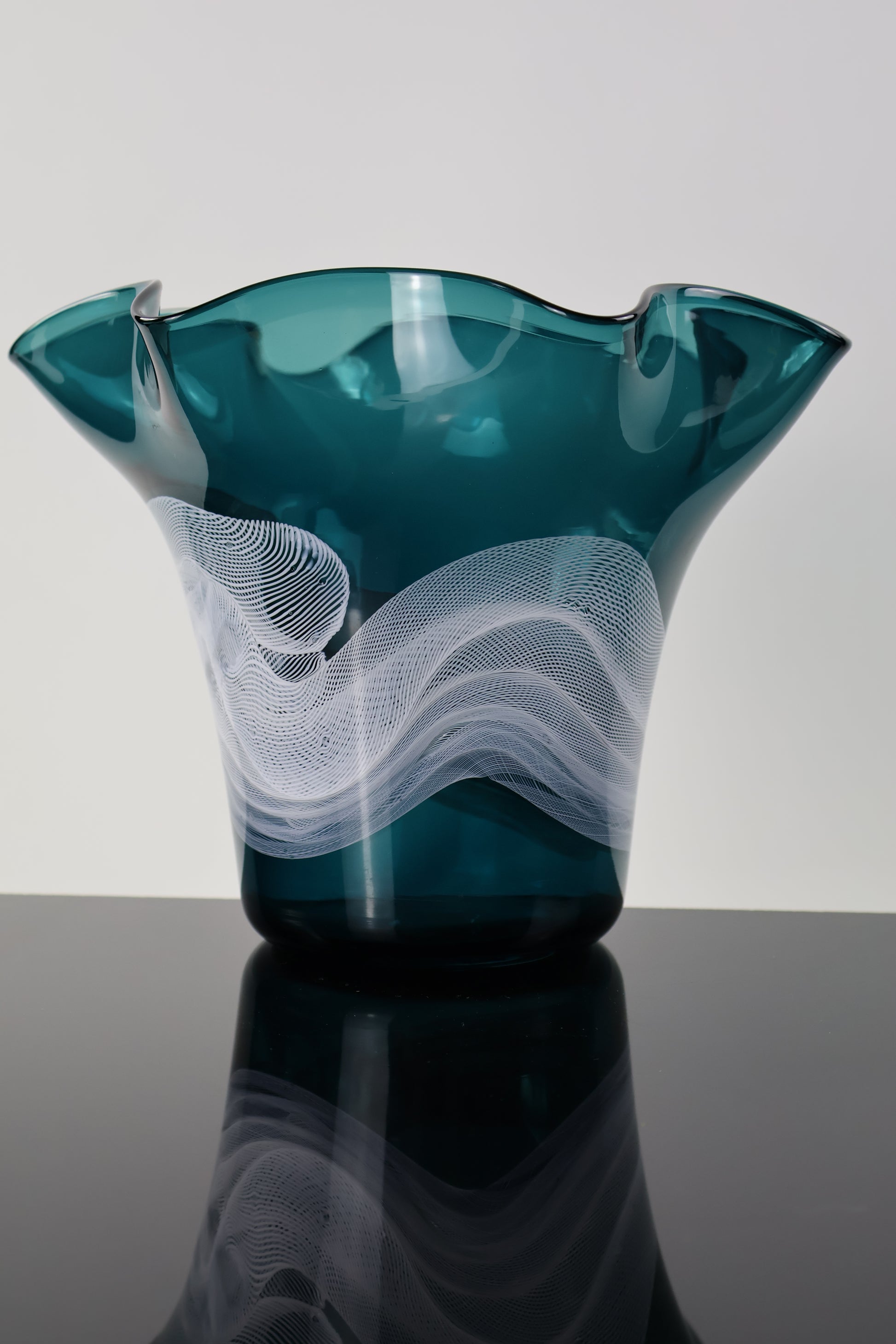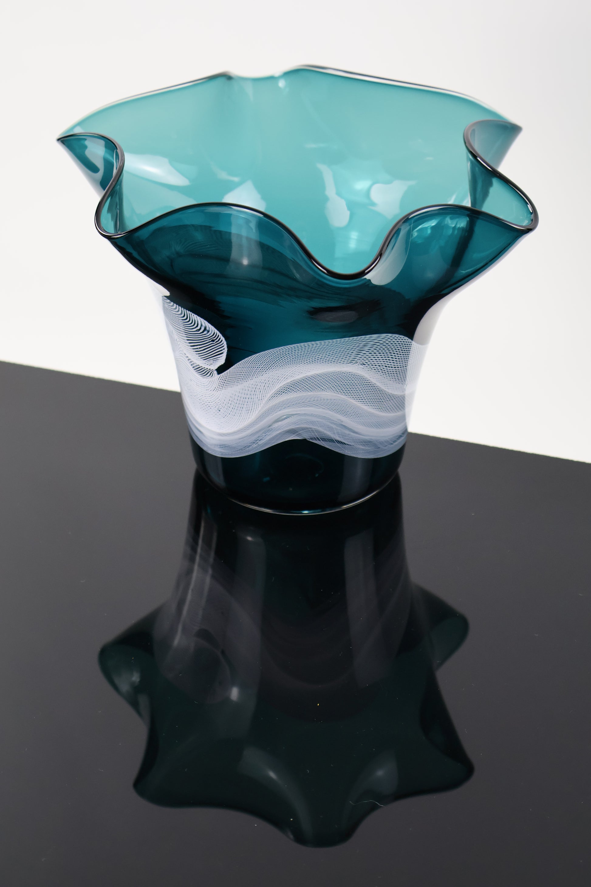 This elegant handblown glass bottle features a rich dark turquoise hue and a abstracted wavy lip. Delicate white glass canes swirl around the body, creating a soft, wispy pattern that seems to float within the glass. Each piece is individually crafted, making every bottle a one-of-a-kind work of art. Perfect as a decorative accent, a flower vase, or a thoughtful handmade gift, this piece beautifully captures the fluidity and craftsmanship of glassblowing.