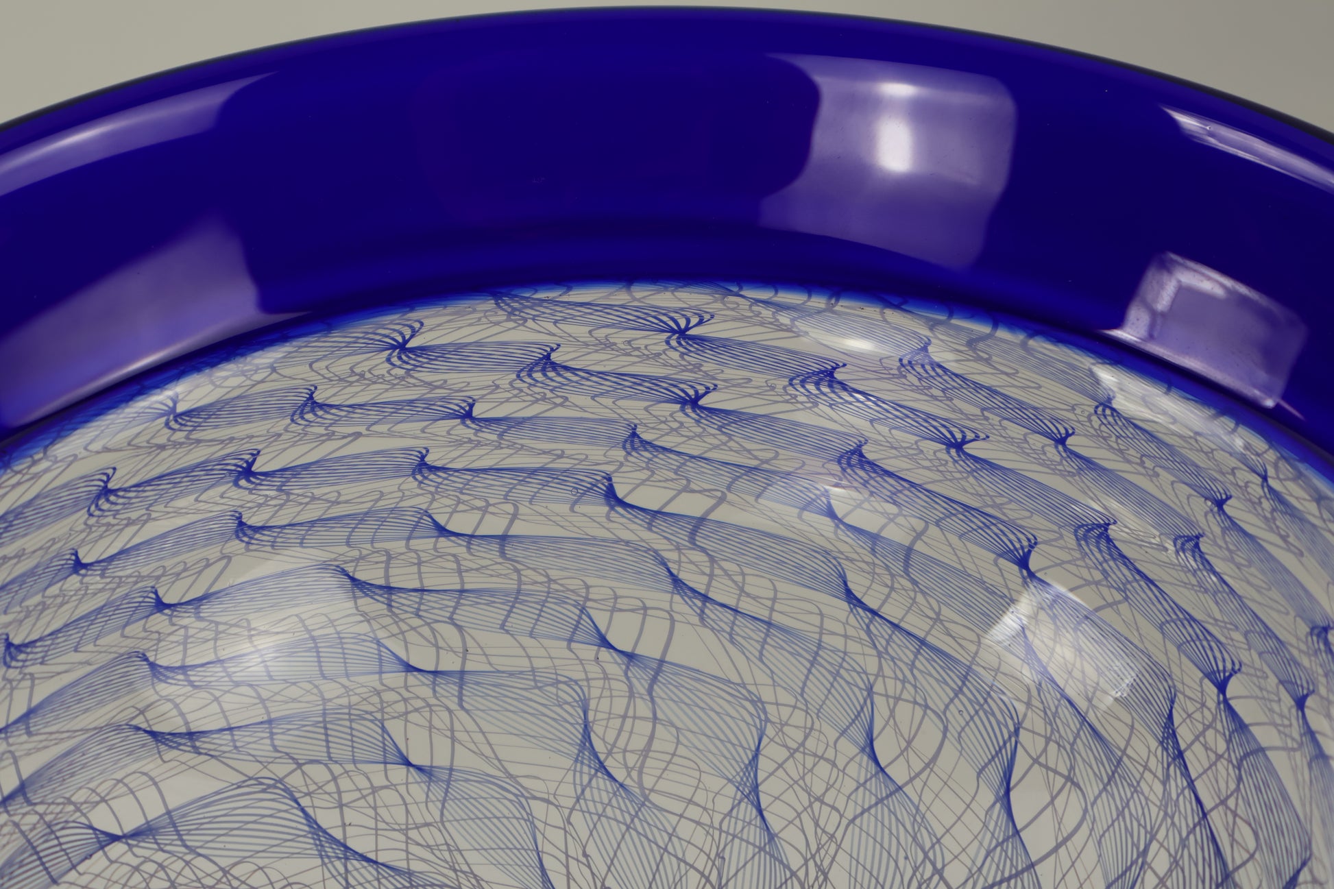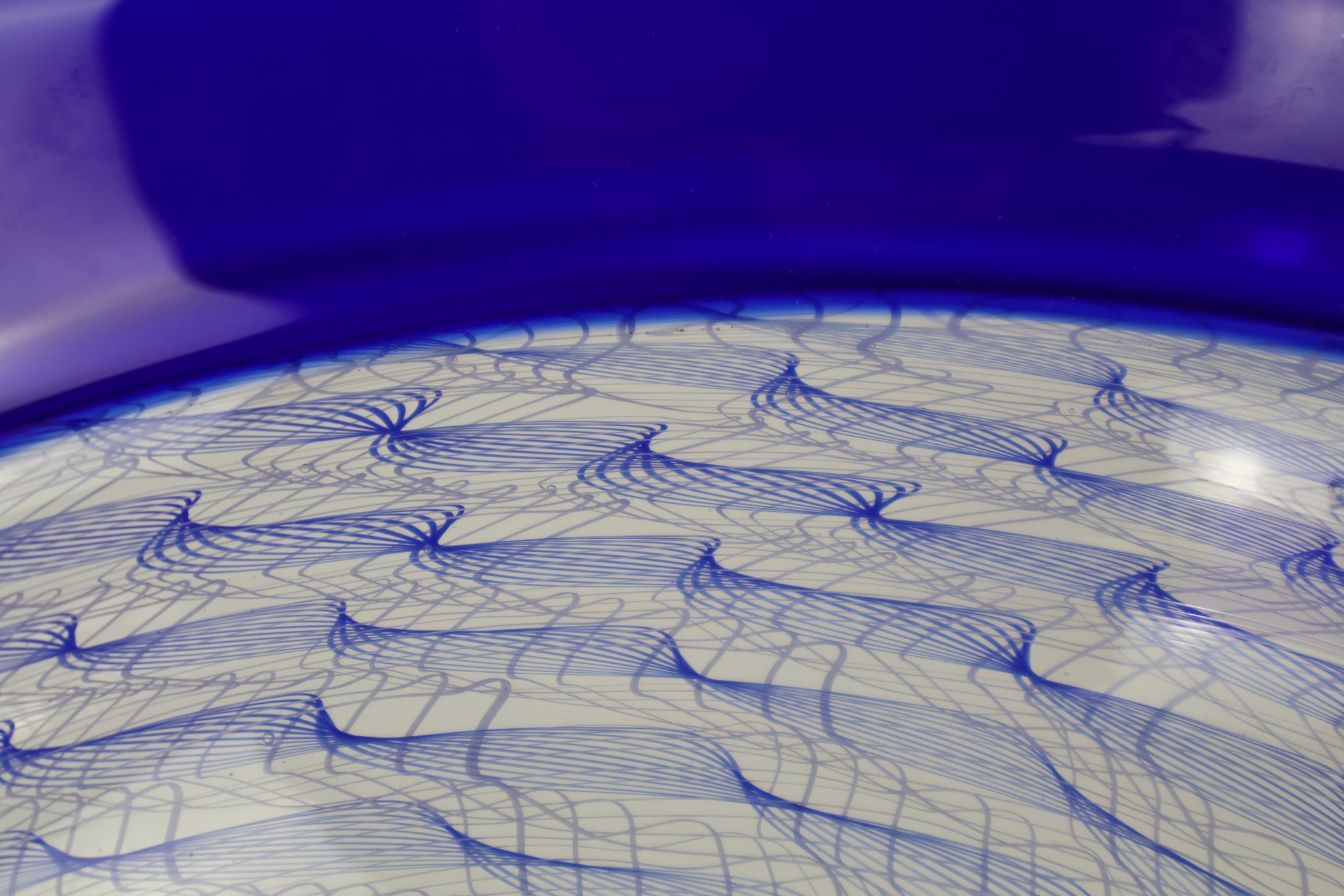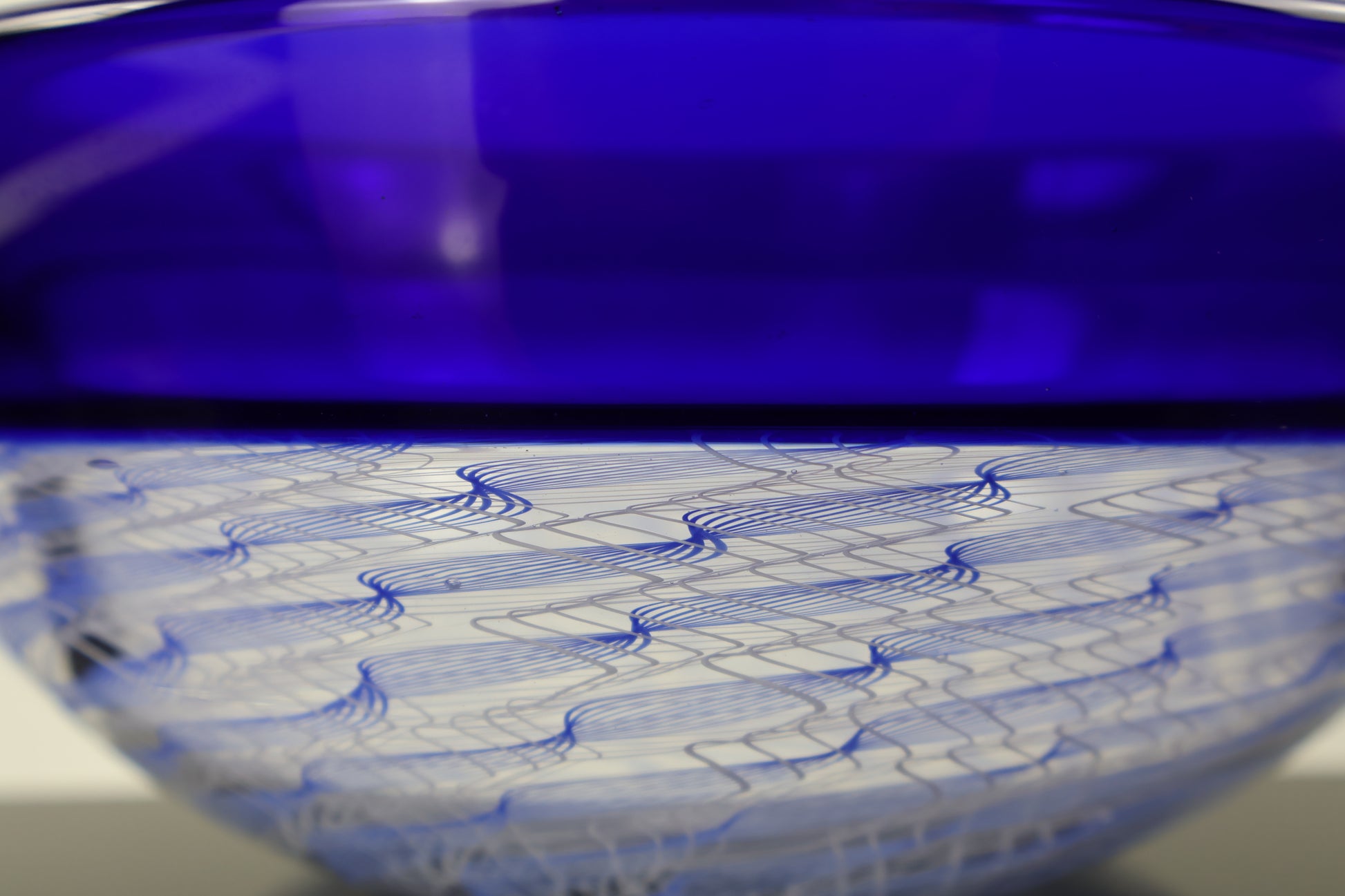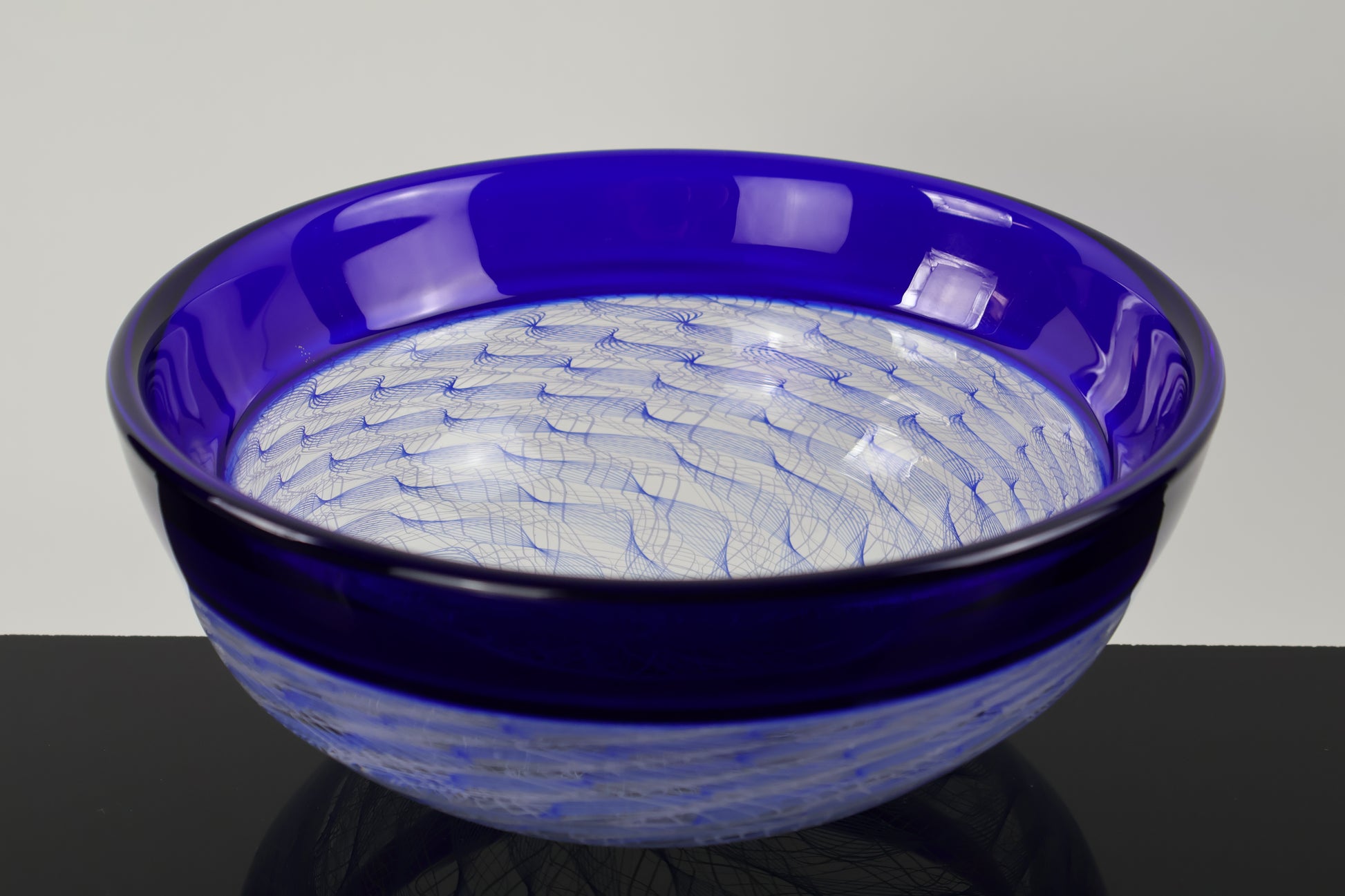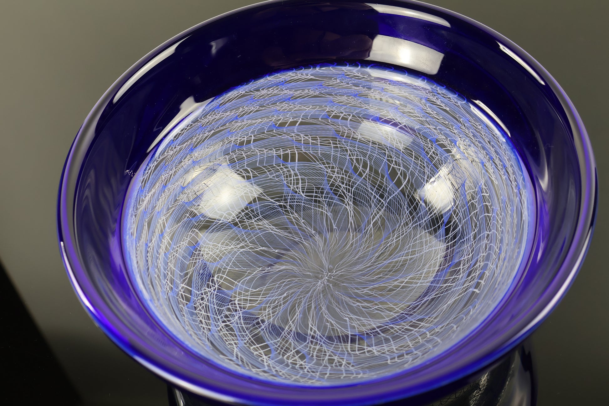 This bowl is made with a blue band at the top and a spiral of balotini canes on the bottom half. The encalmo process gives us pieces that are divided into sections with hard lines between them. This allows us to create different sections of designs on our work. The spiral on the bottom of the bowl creates a mesmerizing spiral of lines that is very intriguing and easy on the eyes.