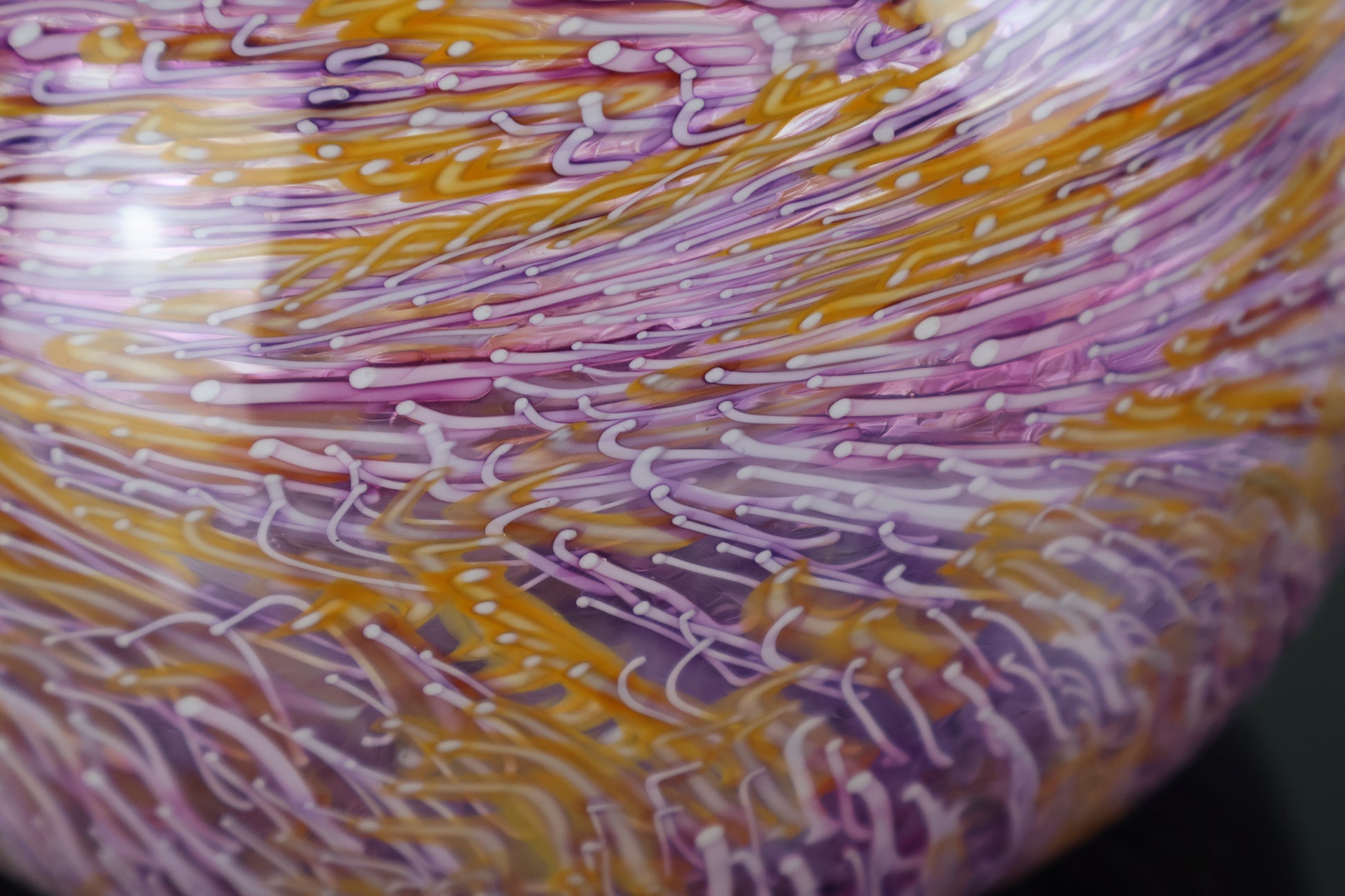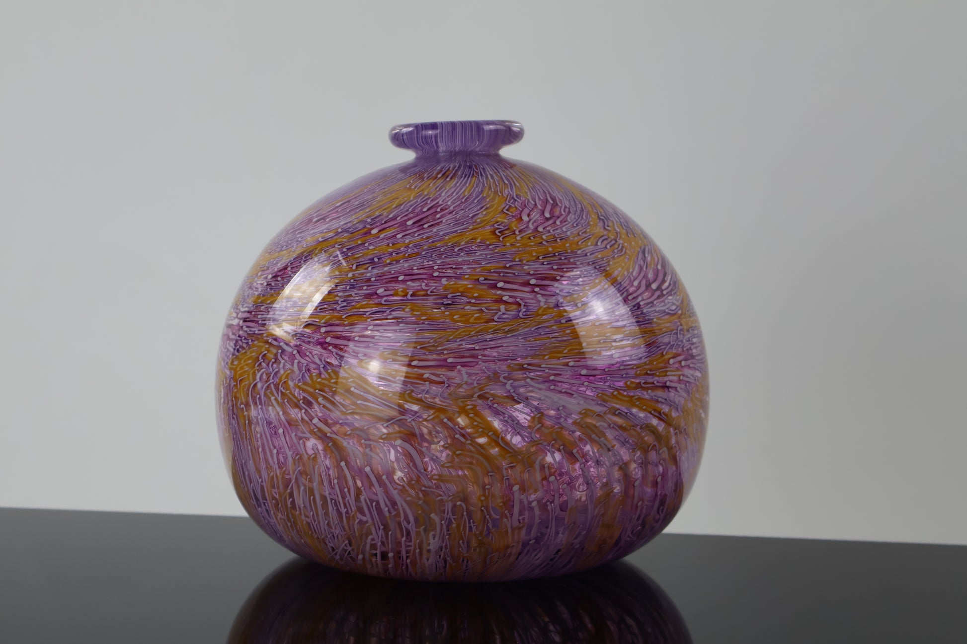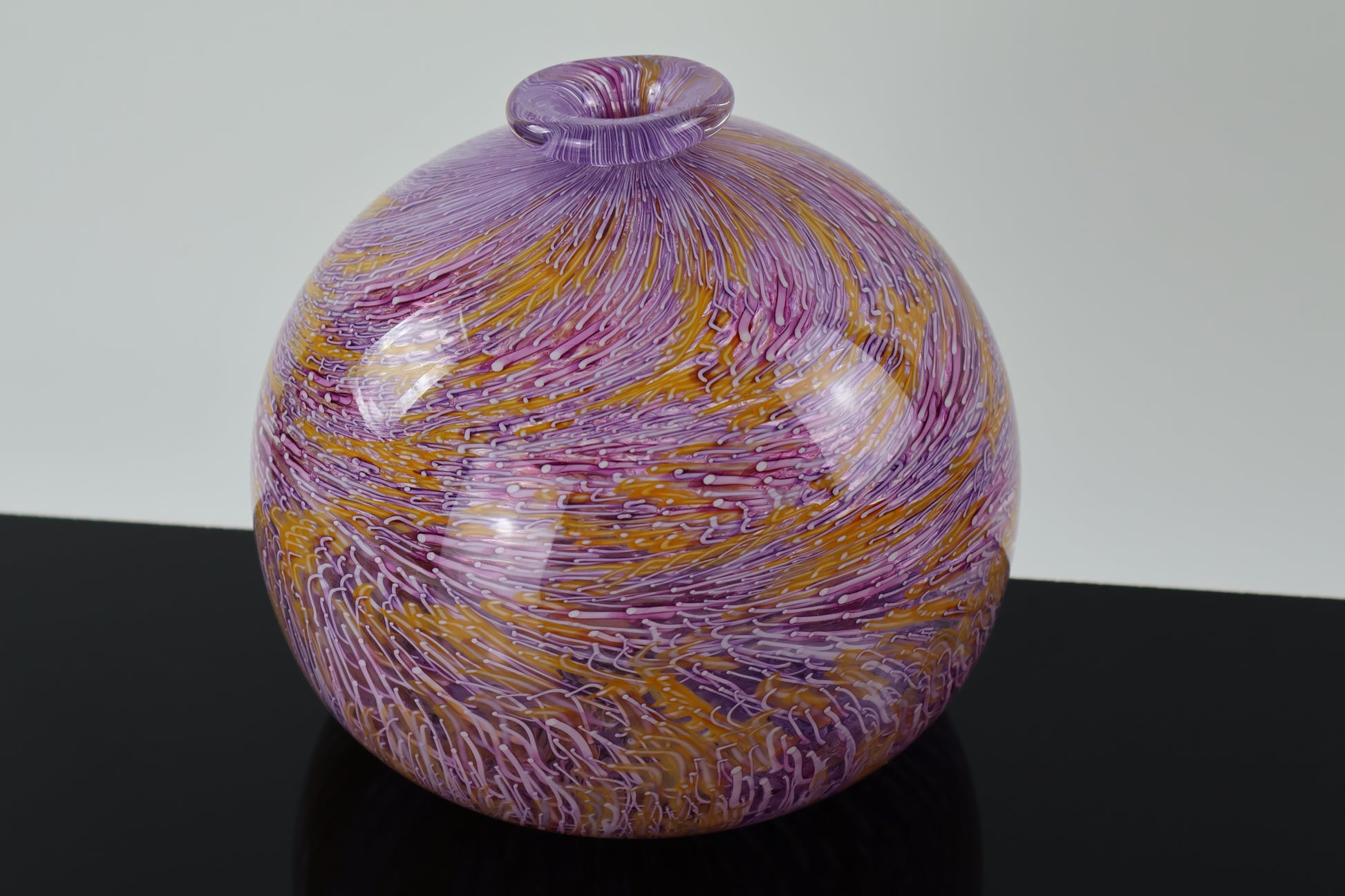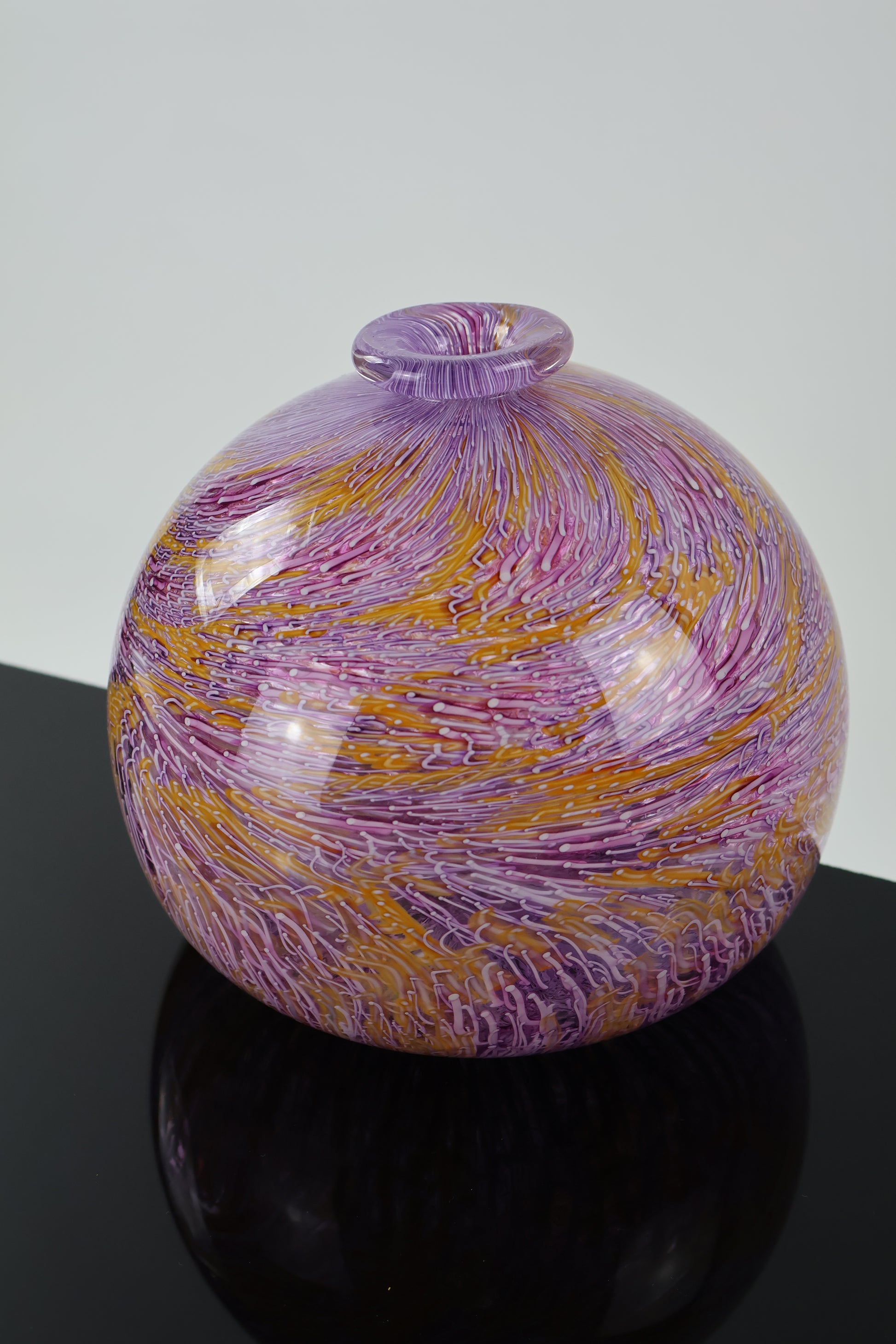 This vibrant round glass vessel features a fluted lip and a swirling murrine pattern created with hand-pulled orange, pink, and white cane. Each line of color flows organically across the surface, creating a dynamic, textural rhythm that makes the piece feel alive. Elegant and eye-catching, it’s a bold statement piece for any art glass collection or modern interior.