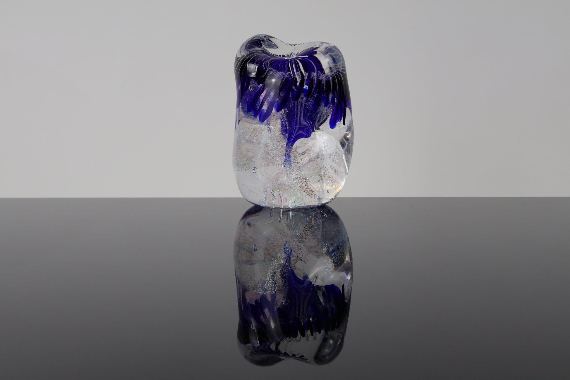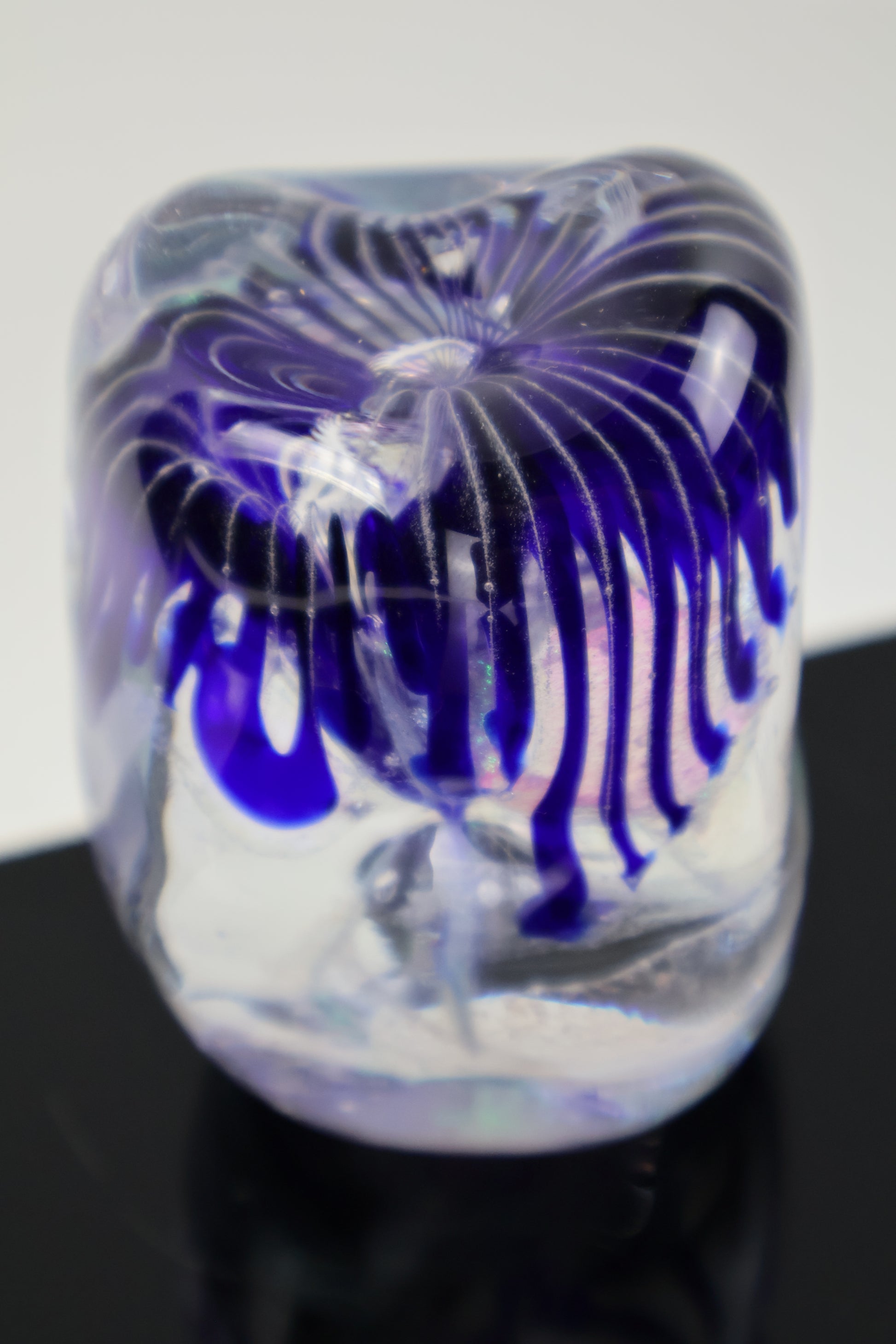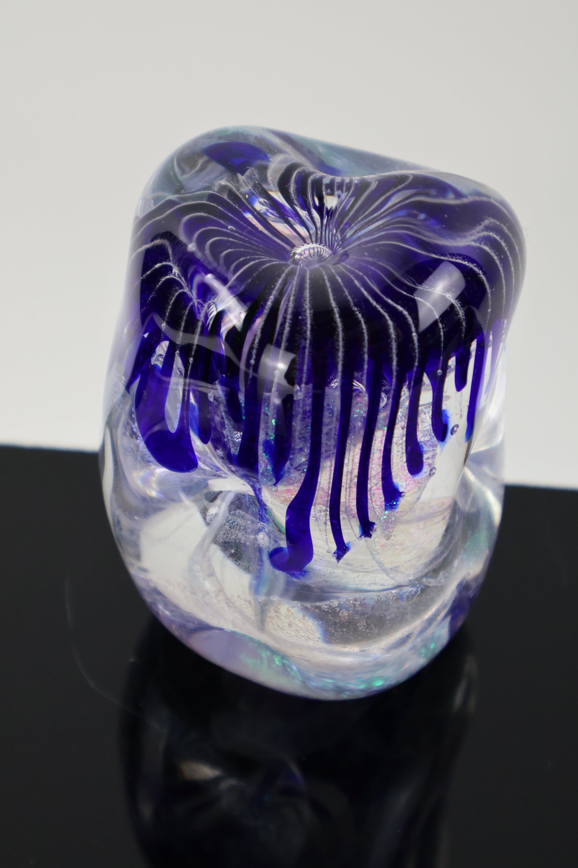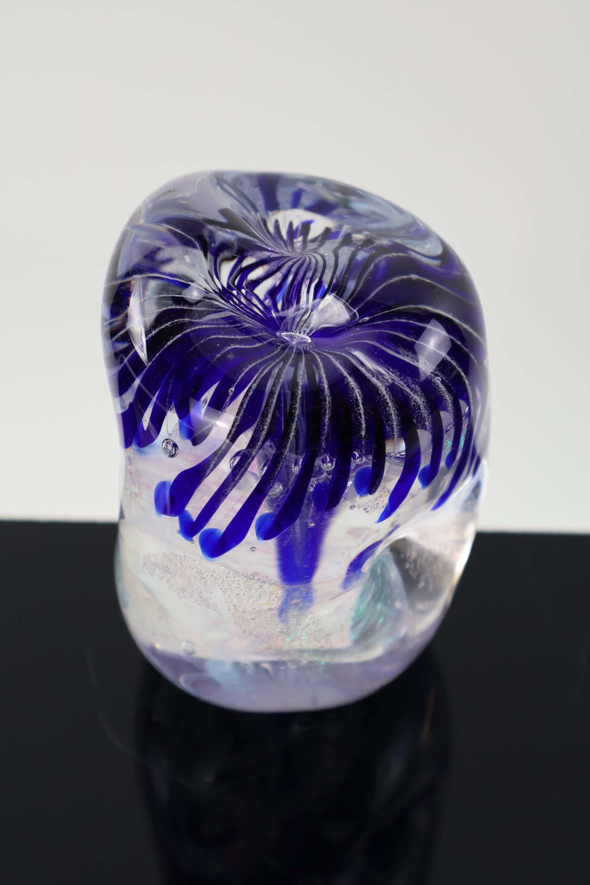 Each of these handblown glass paperweights is a one-of-a-kind creation, featuring a mesmerizing mix of colorful cane pieces suspended among delicate air bubbles. The combination of form, color, and texture captures the motion of molten glass frozen in time. Perfect as a desk accent, decorative object, or gift for art lovers, these pieces highlight the beauty of handcrafted glass.