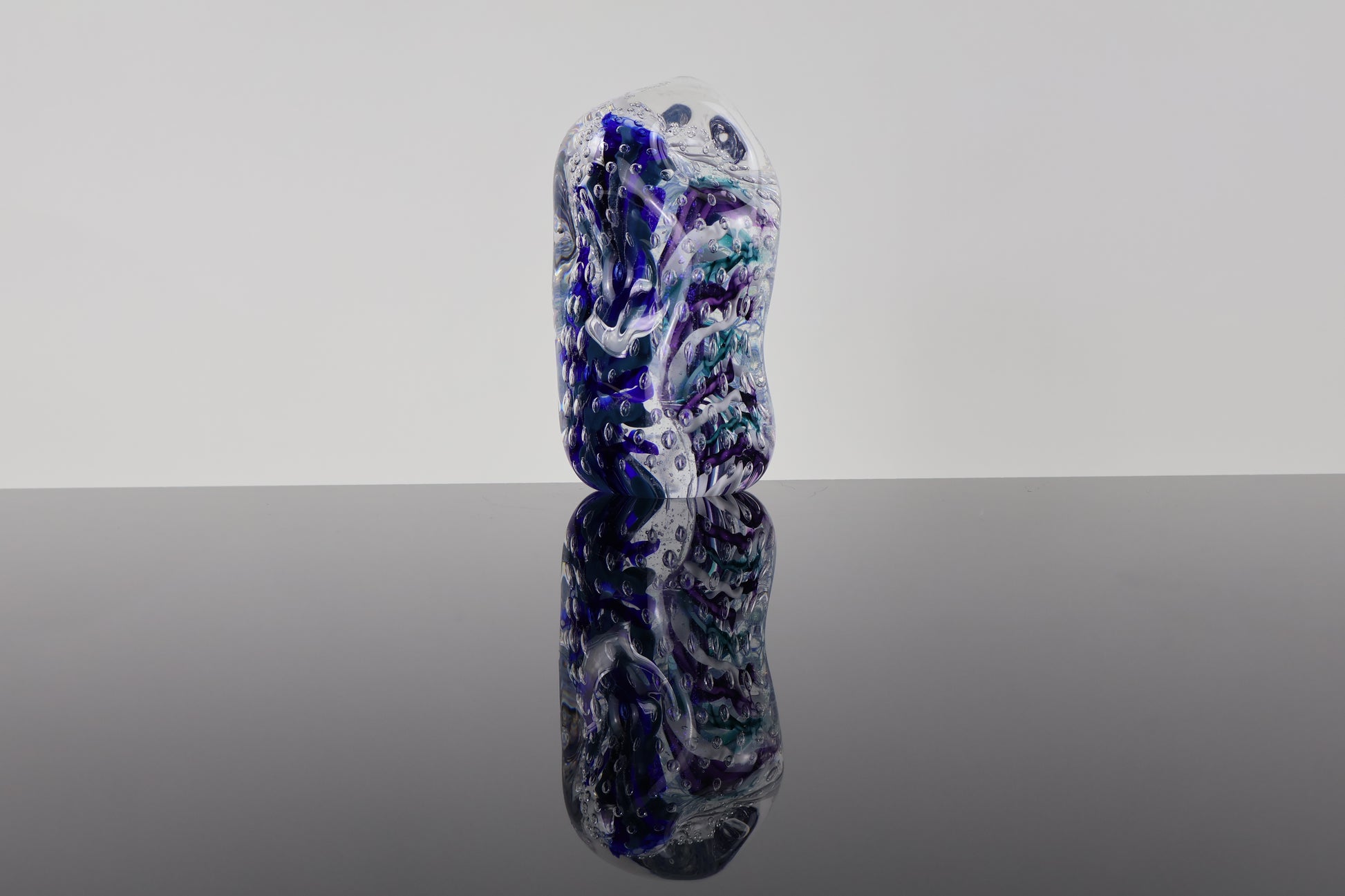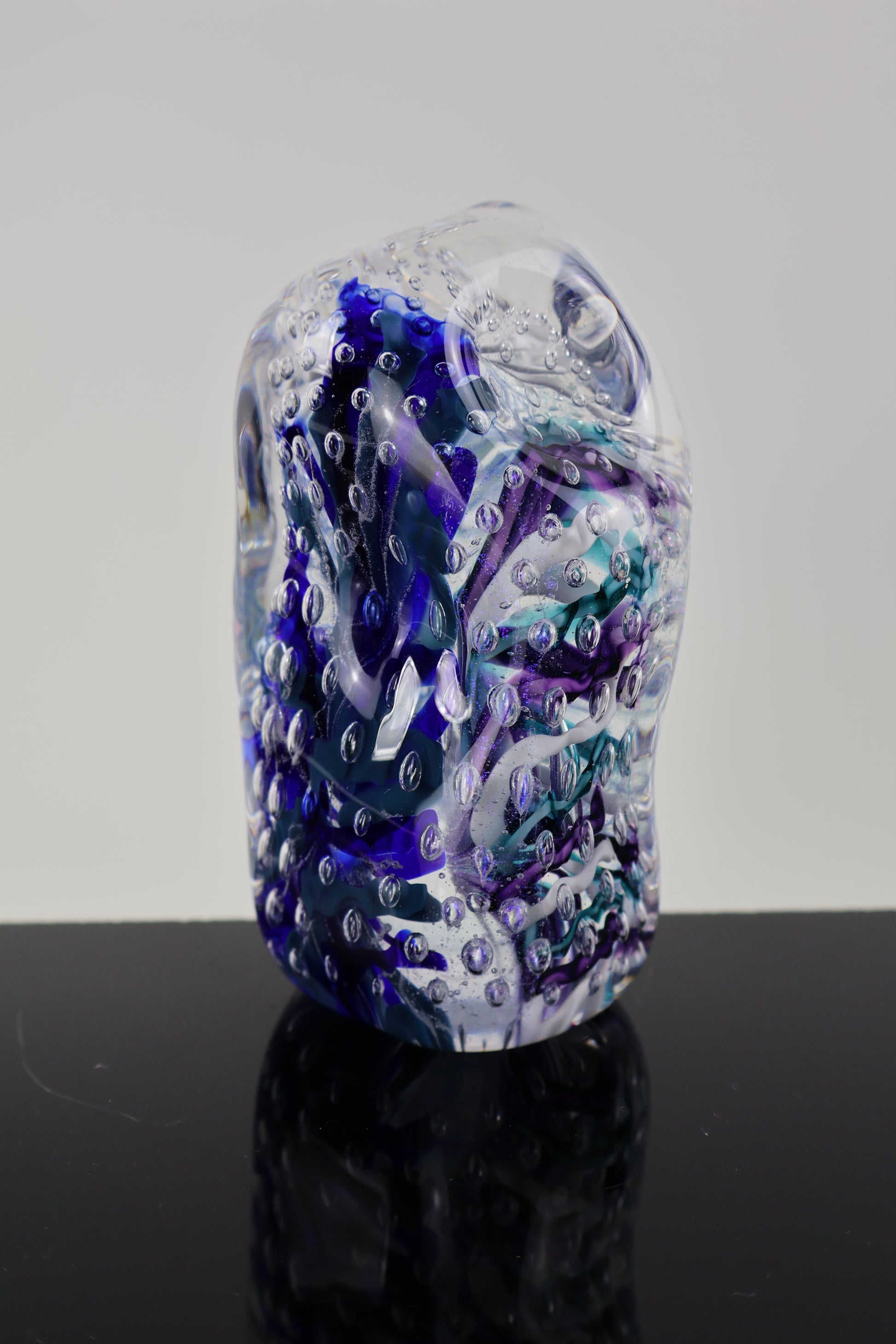 Each of these handblown glass paperweights is a one-of-a-kind creation, featuring a mesmerizing mix of colorful cane pieces suspended among delicate air bubbles. The combination of form, color, and texture captures the motion of molten glass frozen in time. Perfect as a desk accent, decorative object, or gift for art lovers, these pieces highlight the beauty of handcrafted glass.