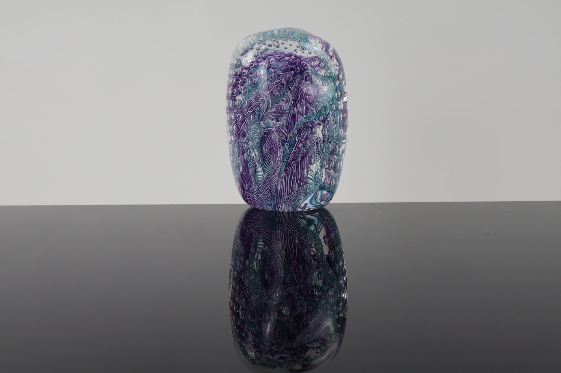 Each of these handblown glass paperweights is a one-of-a-kind creation, featuring a mesmerizing mix of colorful cane pieces suspended among delicate air bubbles. The combination of form, color, and texture captures the motion of molten glass frozen in time. Perfect as a desk accent, decorative object, or gift for art lovers, these pieces highlight the beauty of handcrafted glass.