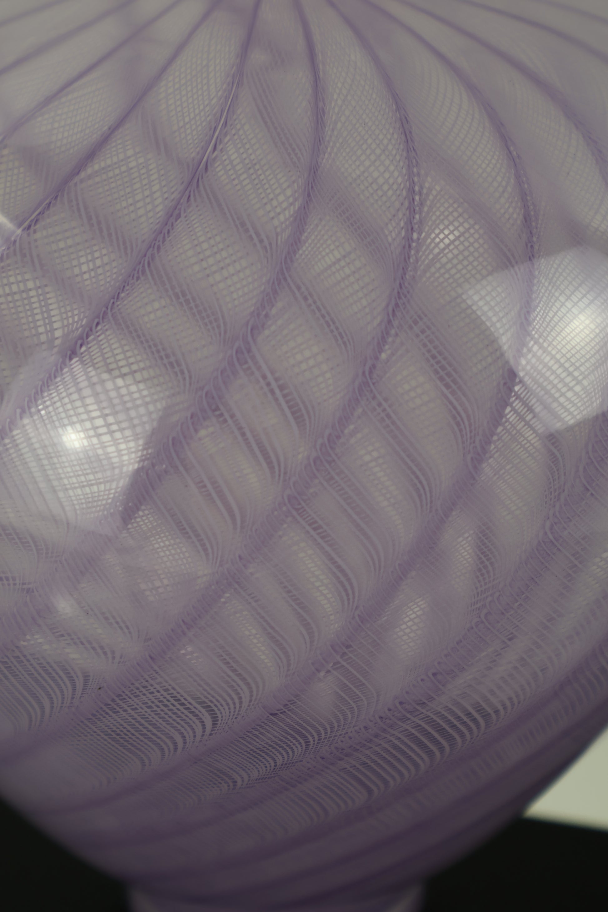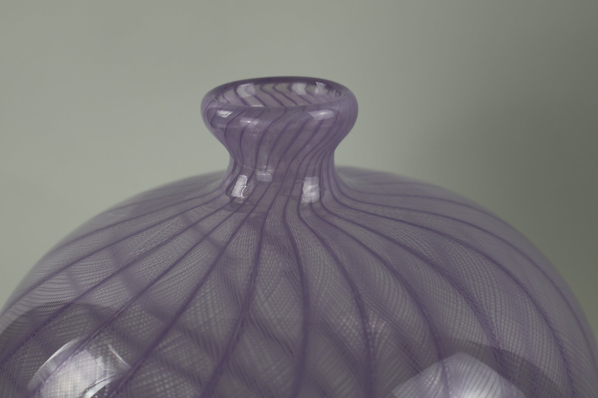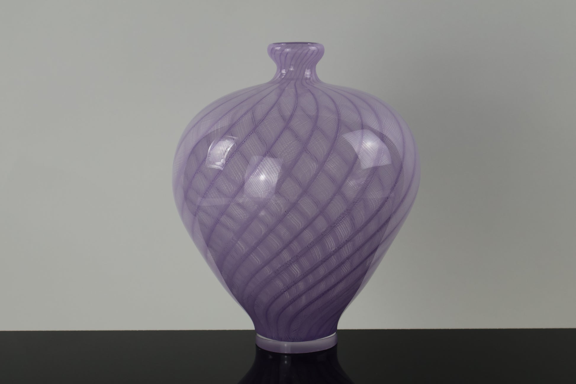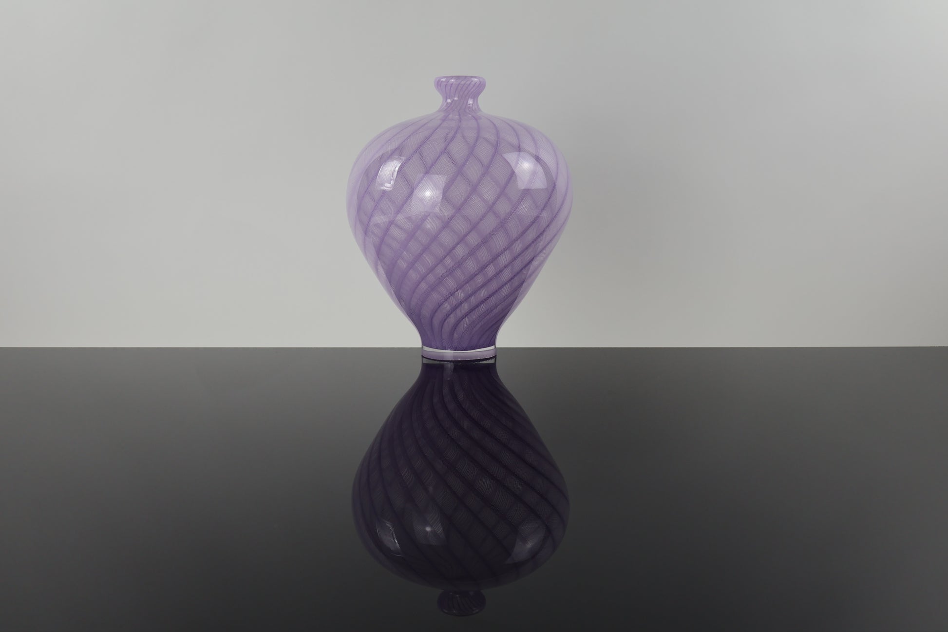 This stunning handblown glass vase is crafted using delicate pink zanfirico cane, a traditional Venetian glassworking technique known for its intricate, ribbon-like patterns. The swirling lattice design creates a mesmerizing visual texture that dances across the vase’s elegant lavender-toned surface. With its soft, rounded form tapering gracefully into a narrow neck, this piece embodies both refined craftsmanship and timeless beauty. A true statement of artisanal skill, it serves as a captivating centerpiece or a sophisticated addition to any art glass collection.